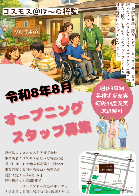 新たに、障がい者のためのグループホームを仙台市泉区将監にオープンいたします。